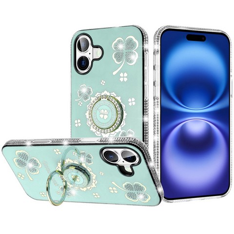 iPhone 17 2025 Glitter w/Diamonds Edges Ring Stand Bling Case Green(Premium Package)