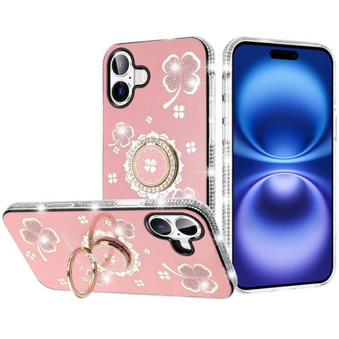 iPhone 17 2025 Glitter w/Diamonds Edges Ring Stand Bling Case Pink(Premium Package)