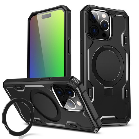 Iphone 15 Pro Max 6.7 Tough Case w/Large Rotating Magnetic Ring Stand Black(Retail Packaged)