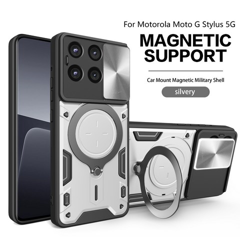 MOTO G Stylus 5G 2025 Twisting Magnetic Ring Stand Case w/Camera cover Silver(Premium Package)